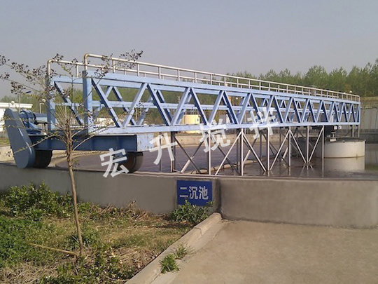 周邊傳動(dòng)刮泥機(jī),主要有鋼梁,溢流堰、傳動(dòng)裝置、穩(wěn)流筒、中心泥罐、排泥槽、刮板、刮泥裝置、浮渣收集和排出設(shè)施,輸電輸氣裝置。